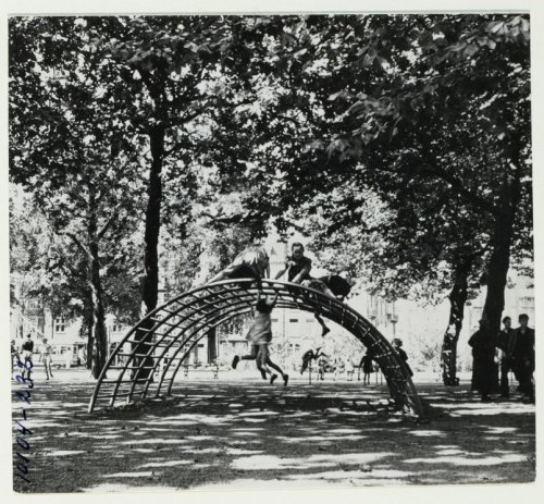 Immediately after the Second World War, Dutch cities were in a state of dereliction. The housing stock was falling dramatically short in both quantitative and qualitative terms. Combined with a dysfunctional infrastructure, it presented planners with the situation of an outright emergency. On top of that, this ravaged urban context was soon to be confronted with the birth peak of the postwar baby boom, whereas almost no space for children was available, neither inside nor outside the house. At that time, some playgrounds existed in the city, but almost all of them were of a private nature and based on membership of the fortunate few. Van Eyck’s playgrounds, initially build on temporarily unused plots of land, can be seen as an emergency measure, but they had a significance far beyond that of a creative solution in a time of need.