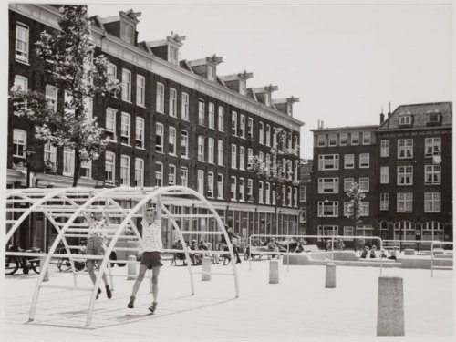 The New Left came to power and the Nieuwmarkt was saved, to become an inspiration for anti-modernization struggles elsewhere in the country. A new model for urban development emerged – “bouwen voor de buurt” (building for the neighborhood) – that was to replace large-scale modernist intervention for small scale participative projects in the neighborhoods. The “structuralist” architectural philosophy of Aldo van Eyck and the group around the magazine Forum was to become a template for a decade to come. One of the first and most symbolic of these projects was the redevelopment of the Nieuwmarkt itself. Maybe not so surprising, Aldo van Eyck was the architect to work on it. Here, his ideas on interstitial space, non-hierarchical composition, and participative planning led to an architecture that could easily mold into the existing tissue of the neighborhood. “Play”, as Huizinga once said, “is a serious matter”.