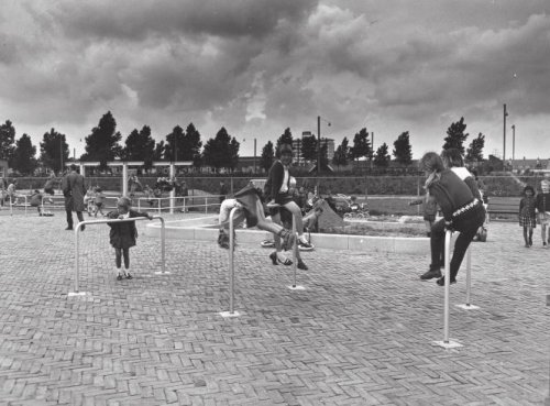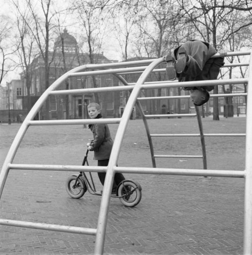 For him the playgrounds were an opportunity to test out his ideas on architecture, relativity and imagination. Relativity in the sense that connections between elements were determined by their mutual relationships rather than by a central hierarchical ordering principle. All elements were equal: the playgrounds designed by Van Eyck were exercises in non-hierarchical composition (8). Van Eyck also designed the playground equipment himself, including the tumbling bars, chutes and hemispheric jungle gyms, and his children tested them. To him, playing equipment was an integral part of the commission. The purpose was to stimulate the minds of children. The hemispherical jungle gym was not just something to climb. It was a place to talk and a lookout post. Covered with a rug, it became a hut. These sandpits, tumbling bars and stepping stones were placed throughout the Netherlands.