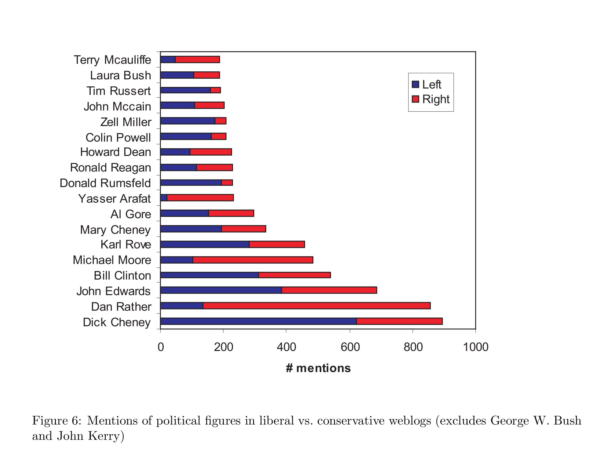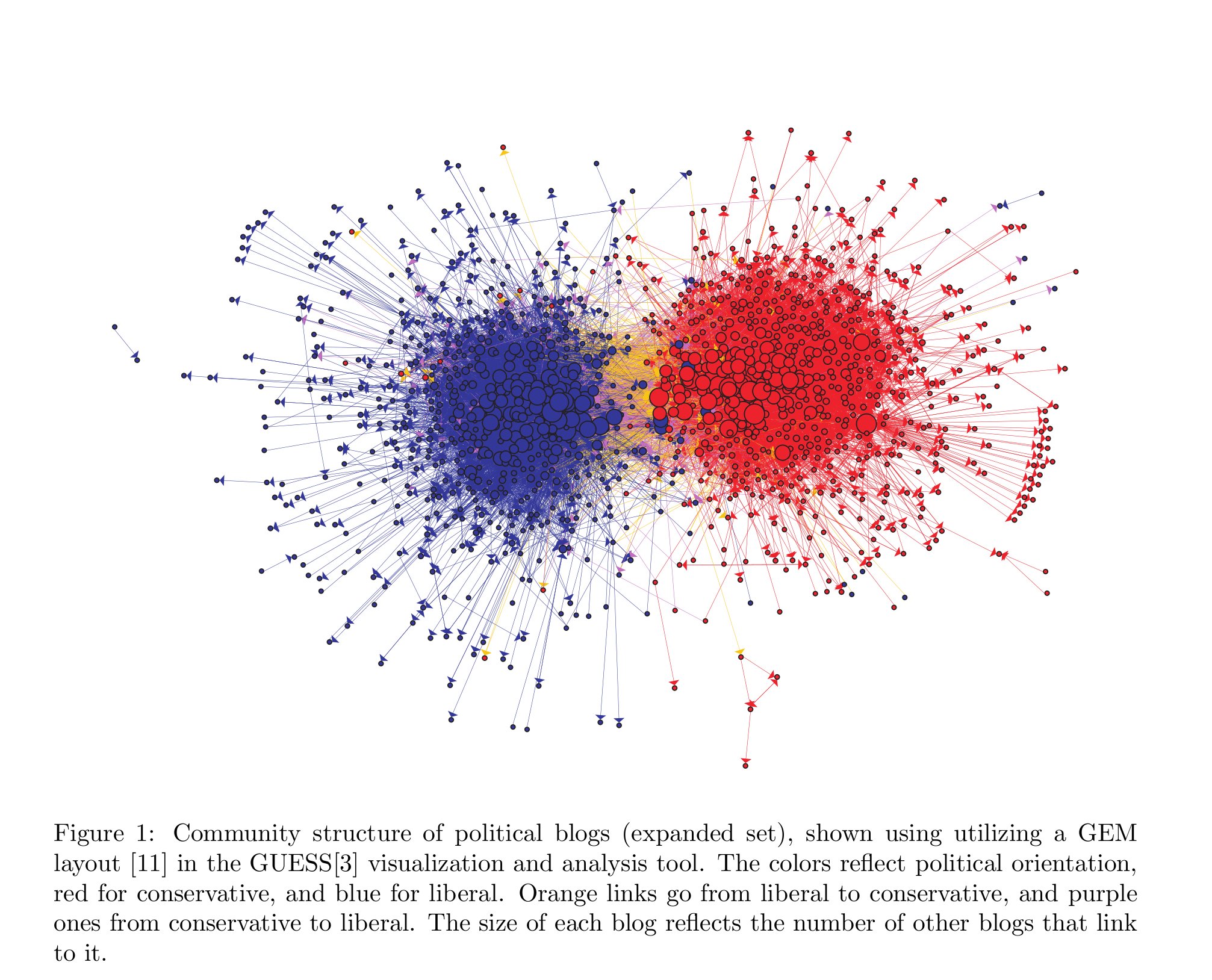 Dit beeld wordt bevestigd door een onderzoek over de politieke blogosfeer tijdens de verkiezingen in 2004 (Adamic & Glance 2004) met als toepasselijke titel ‘Divided They Blog’. Een interessante observatie die Adamic & Glance daarbij maken, is dat politieke positionering voornamelijk plaatsvindt via negatieve identificatie: Cheney en Rumsfeld werden veruit het meest besproken onder democratische bloggers, terwijl Michael Moore en Arafat het meest besproken werden op rechtse blogs.