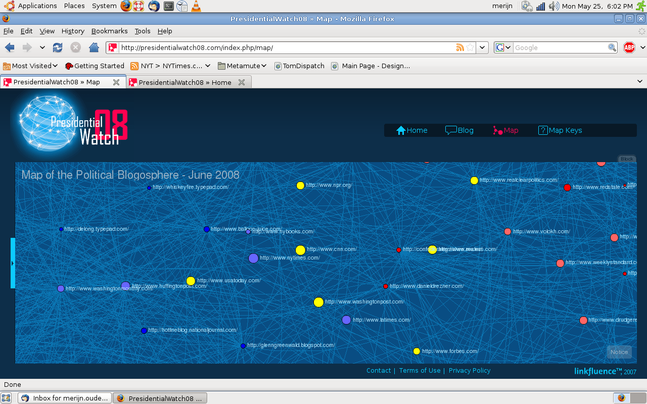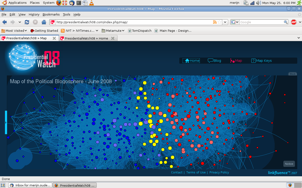 Internet heeft de neiging om microgemeenschappen te creëren – eilandenrijken van eensgezinden. De blogosphere werkt daardoor als middelpuntvliedende kracht, in tegenstelling tot de krant die een meer centraliserende werking heeft op de publieke opinie. Om mijn stelling enigszins te illustreren wil ik verwijzen naar wat screenshots van een cartografie van de Amerikaanse blogosphere tijdens de verkiezingen van 2008.