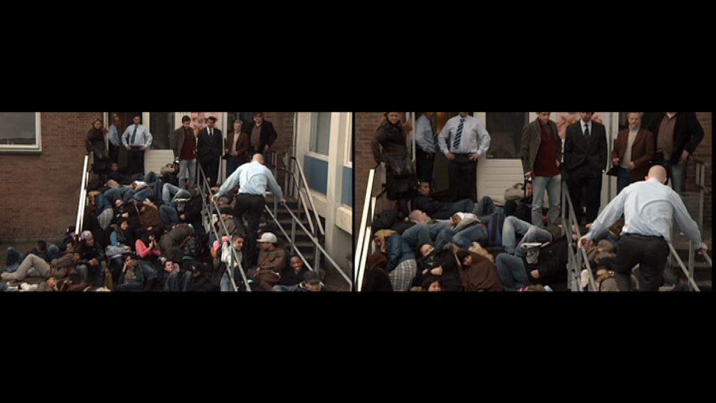 ‘Wat er bijzonder is aan de tentoonstelling, is dat we het zo opzetten om te pogen de beweging van de menigtes in de films te spiegelen aan de beweging van de menigtes in het museum.’ Hij introduceert vervolgens Schoolyard, terwijl hij in de straal van de projector gaat staan. Wat hij probeert te doen, zo stelt Mik, is te zorgen dat de toeschouwer altijd bijna in de projectie staat, zodat passanten onderdeel van de film worden, als ze door de straal van de projector heenlopen. Hij ziet het beeld het liefst overgaan in de ruimte, zodat er altijd sprake is van een architectonische dimensie, de mogelijkheid de lichamen van de toeschouwers te spiegelen met de lichamen van de acteurs in de film.