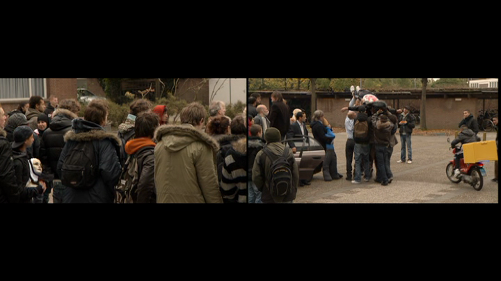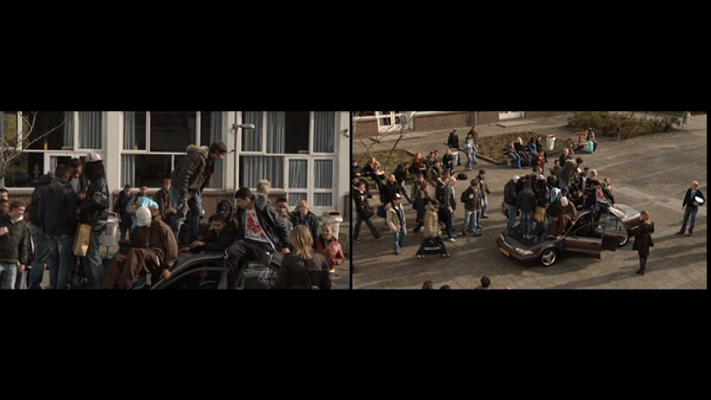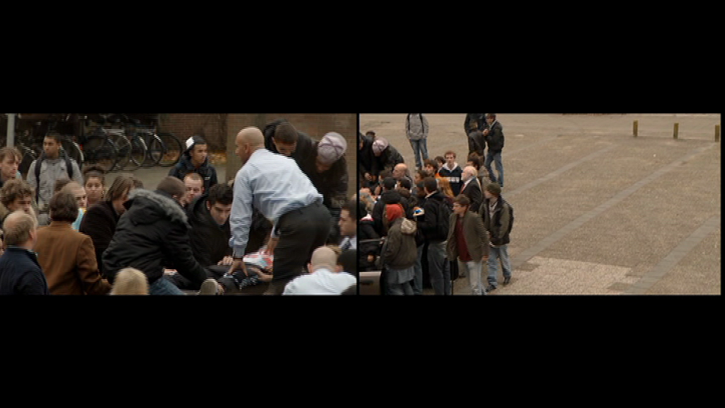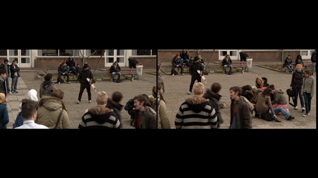 De basale scène van Schoolyard betreft een menigte van middelbare scholieren, van een zeer multi-etnische samenstelling, typisch te vinden in de volkswijken van de grote steden. Velen van hen zijn Marokkaans-Nederlandse jongeren, een dankbaar onderwerp van media stereotypering in Nederland. De groep staat op het schoolplein, buitengesloten uit de school, betrokken in een conflictueuze choreografie met beveiligingspersoneel en wat lijkt op leraren of schoolstaf. Bepaalde scènes – de menigte leerlingen die het schijnbaar levenloze lichaam van een medescholier boven het hoofd dragen – doen denken aan de begrafenisoptochten ten tijde van de Palestijnse Intifada. Mediabeelden van het conflict in het Midden-Oosten worden zo vermengd met de alledaagse Nederlandse werkelijkheid. Andere scènes lijken te refereren aan een algemener thema van jeugdige subversie. Er is een scooter race die op enigszins lachwekkende wijze doet denken aan de illegale autoraces in Amerikaanse highschool films, denk aan Rebel Without a Cause. Scènes waarin de menigte languit op de grond ligt – een vloerkleed van lichamen – doet denken aan de typische ‘die-in’ protesten uit de jaren zeventig. Deze sporen van intifada en jeugdopstand zijn gemengd met weer andere thema’s. Een student die de school uitloopt, onder enthousiast applaus van de menigte, doet denken aan de exit-scènes in politieke rechtszaken. Een student die gepest wordt en een prullenbak over zijn hoofd krijgt, doet denken aan pest- en treiterpraktijken en stigmatisering. Gedurende de hele film is er sprake van een wisselende emotionele spanning: de opwinding van confrontatie en crisismomenten gevolgd door stille anticipatie, collectieve rouw of de ons allen vertrouwde verveling van middelbare schooltijd. Dit alles wordt gepresenteerd in constante flux, Het ene moment zijn het de jongeren die op de auto’s plaats nemen. Het volgende moment is het schoolpersoneel. Wat ons laat weten dat op dit virtuele schoolplein geen enkele rol of regel vaststaat.